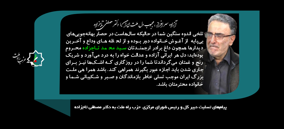 آزاده سر افراز ، مجبوب دل ملت ایران؛ دکتر مصطفی تاجزاده تلخی اندوه سنگین شما در حالیکه سالهاست در حصار بهانهجوییهای بیپایهاز آغوش خانواده دور بوده و از لحظه های وداع و آخرین دیدارها همچون داغ برادر ارجمندتان سید محمد تاجزاده محروم بودهاید؛ دل هر ایرانی آزاده و عدالت خواه را به درد میآورد و شریک رنج و غمتان میگرداندتا شما را در روزگاری که اشکها نیز برای جاری شدن باید اجازه عبور بگیرند همراهی کند. باشد همراهی ملت بزرگ ایران موجب تسلی خاطر بازماندگان و صبر و شکیبائی شما و خانواده محترمتان باشد.
