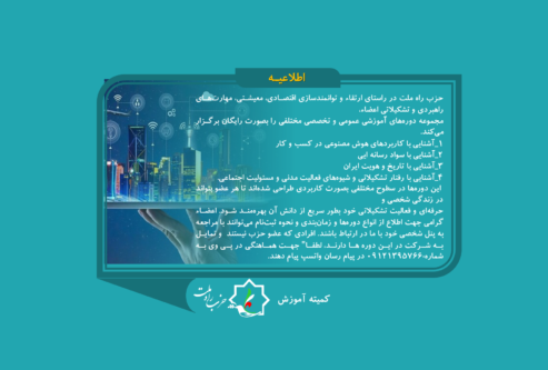 اطلاعیـــــــه حزب راه ملت در راستای ارتقاء و توانمندسازی اقتصادی، معیشتی، مهارتهای راهبردی و تشکیلاتی اعضاء، مجموعه دورههای آموزشی عمومی و تخصصی مختلفی را بصورت