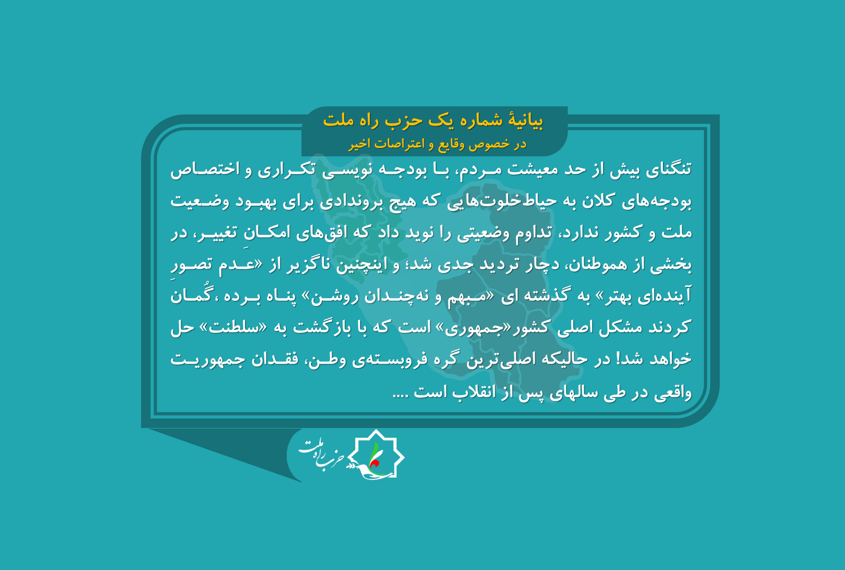 - بیانیه شماره یک حزب راه ملت در خصوص وقایع و اعتراضات اخیر. تشریح وضع موجود